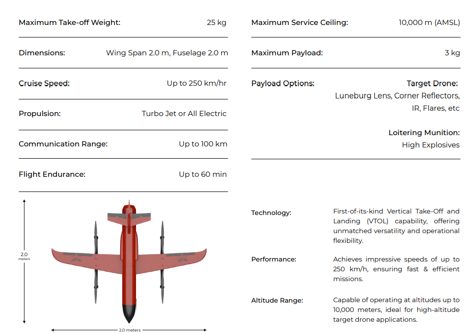 The Fire Bolt Jet represents cutting-edge technology in the realm of unmanned aerial vehicles (UAVs), specifically tailored for target drone applications. Featuring the first of its kind VTOL hybrid jet concept, this target drone has an impressive speed of 250km/hr and can operate at an altitude of up to 10,000m.