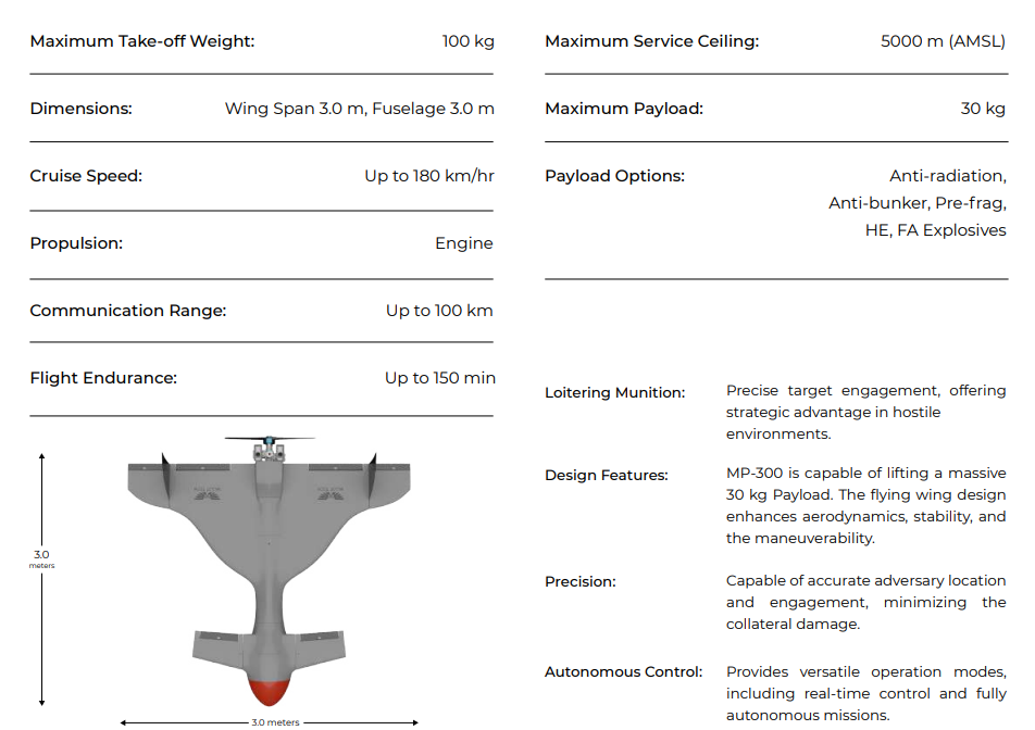 The MP-300 stands as an advanced loitering munition system, equipped with a 75kg